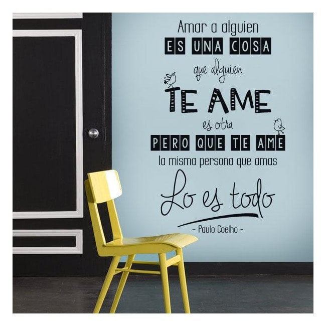 “Amar a alguien es una cosa. Que alguien te ame es otra. Pero que te ame la misma persona que amas lo es todo”., con esta bonita frase de Paulo Coelho en Vinilos Casa ® te proponemos este exclusivo vinilo decorativo, con el que podrás decorar paredes, decorar cristales, decorar puertas, decorar armarios, decorar objetos, decorar tiendas, decorar salones, decorar comercios, decorar escaparates, decorar habitaciones, etc... de forma rápida, fácil y muy económica. Este vinilo decorativo es una buena opción para decorar habitaciones juveniles. En Vinilos Casa ® todos nuestros vinilos decorativos, adhesivos para paredes o pegatinas para paredes son fabricados con materiales de alta calidad, garantizándote así un producto duradero y al mejor precio del mercado. Este vinilo decorativo es ideal para decorar interiores o decorar exteriores.